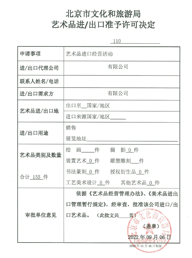 北京市文化和旅游局藝術品進出口準予決定書(樣例)
