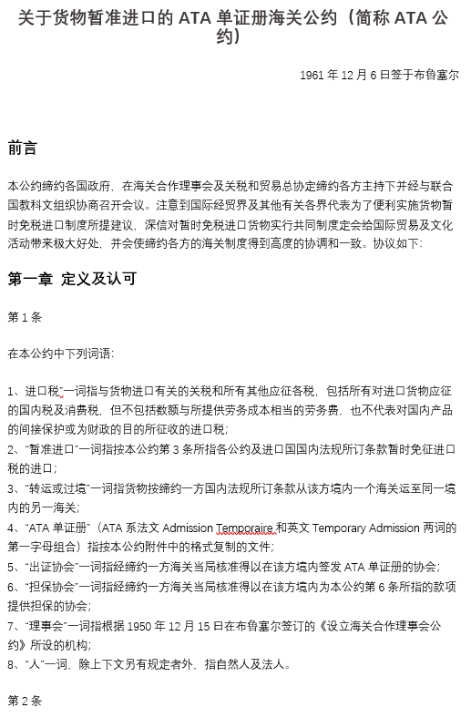 關(guān)于貨物暫準(zhǔn)進(jìn)口的ATA單證冊(cè)海關(guān)公約(簡(jiǎn)稱ATA公約)
