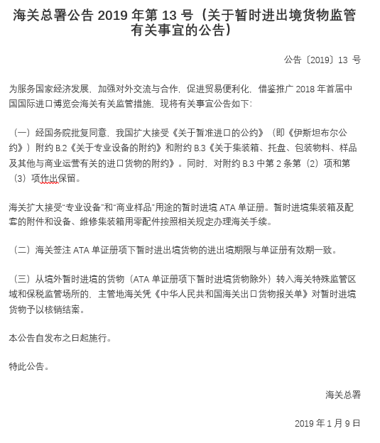 海關(guān)總署公告2019年第13號(關(guān)于暫時進(jìn)出境貨物監(jiān)管有關(guān)事宜的公告)