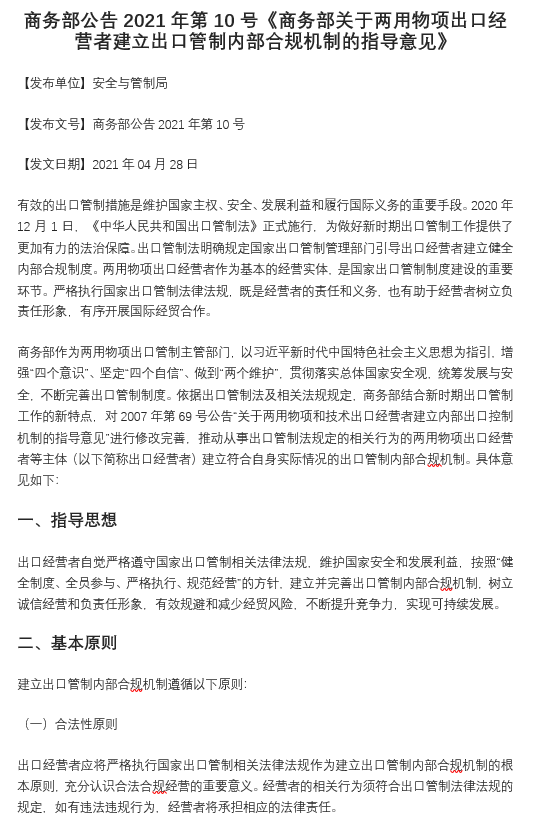 商務(wù)部公告2021年第10號(hào)《商務(wù)部關(guān)于兩用物項(xiàng)出口經(jīng)營(yíng)者建立出口管制內(nèi)部合規(guī)機(jī)制的指導(dǎo)意見》