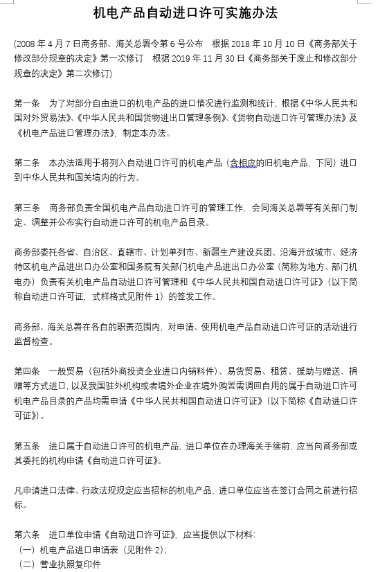 機電產(chǎn)品自動進口許可實施辦法