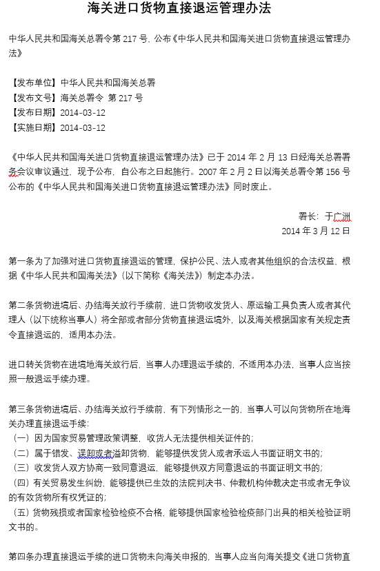 海關(guān)進口貨物直接退運管理辦法