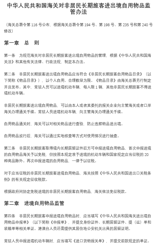 中華人民共和國(guó)海關(guān)對(duì)非居民長(zhǎng)期旅客進(jìn)出境自用物品監(jiān)管辦法