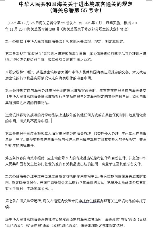 中華人民共和國(guó)海關(guān)關(guān)于進(jìn)出境旅客通關(guān)的規(guī)定 (海關(guān)總署第55號(hào)令)