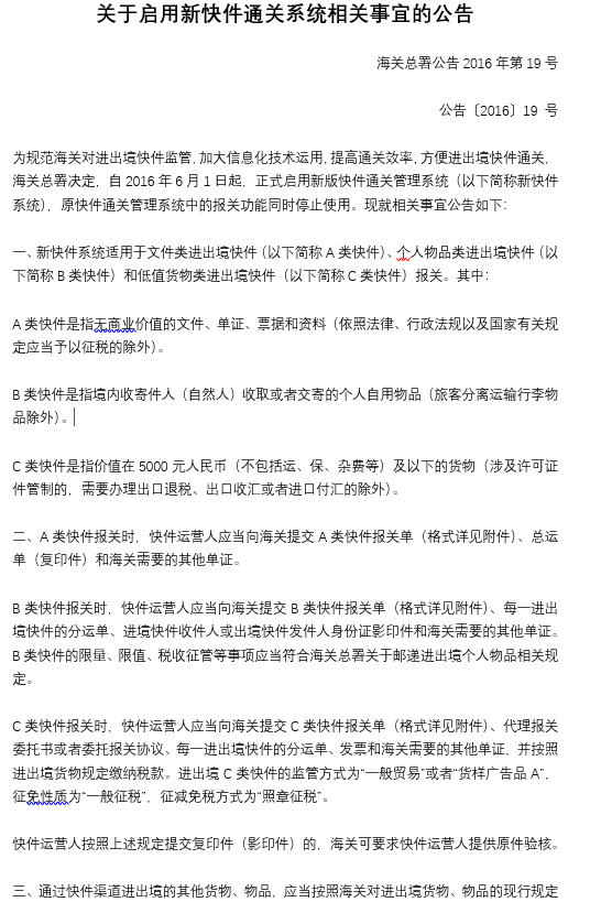 關(guān)于啟用新快件通關(guān)系統(tǒng)相關(guān)事宜的公告