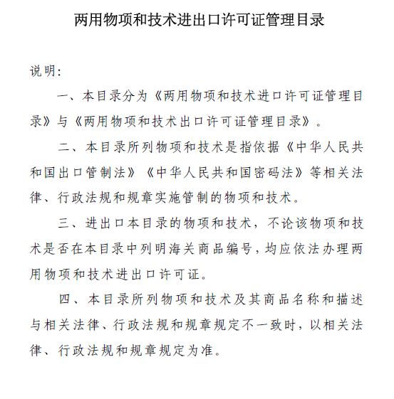 兩用物項(xiàng)和技術(shù)進(jìn)出口許可證管理目錄