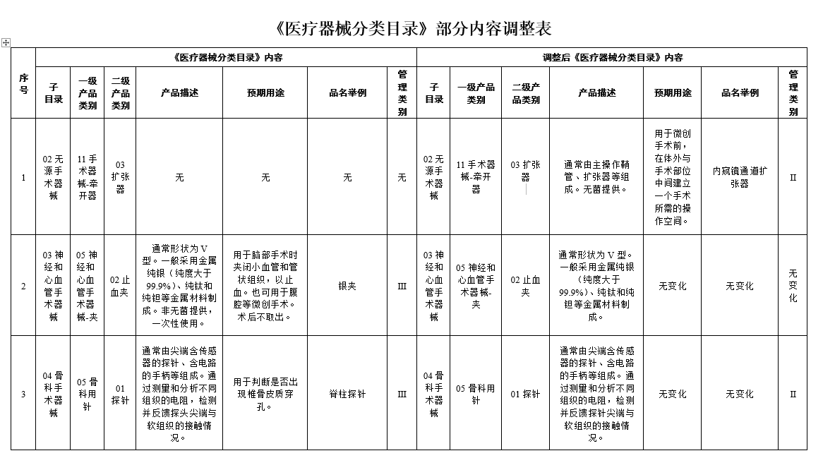 醫(yī)療器械分類目錄-部分內(nèi)容調(diào)整表